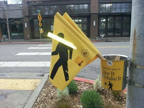 Here is an idea that other communities are using to aid pedestrians in crossing safely. These flags are placed on both sides of the street. Pedestrians wanting to cross the street take a flag, step to the curb, hold it up or wave it at oncoming traffic to alert them that they intend to cross. It gets the drivers' attention. Then after crossing, they place it in the holder on the other side of the street.